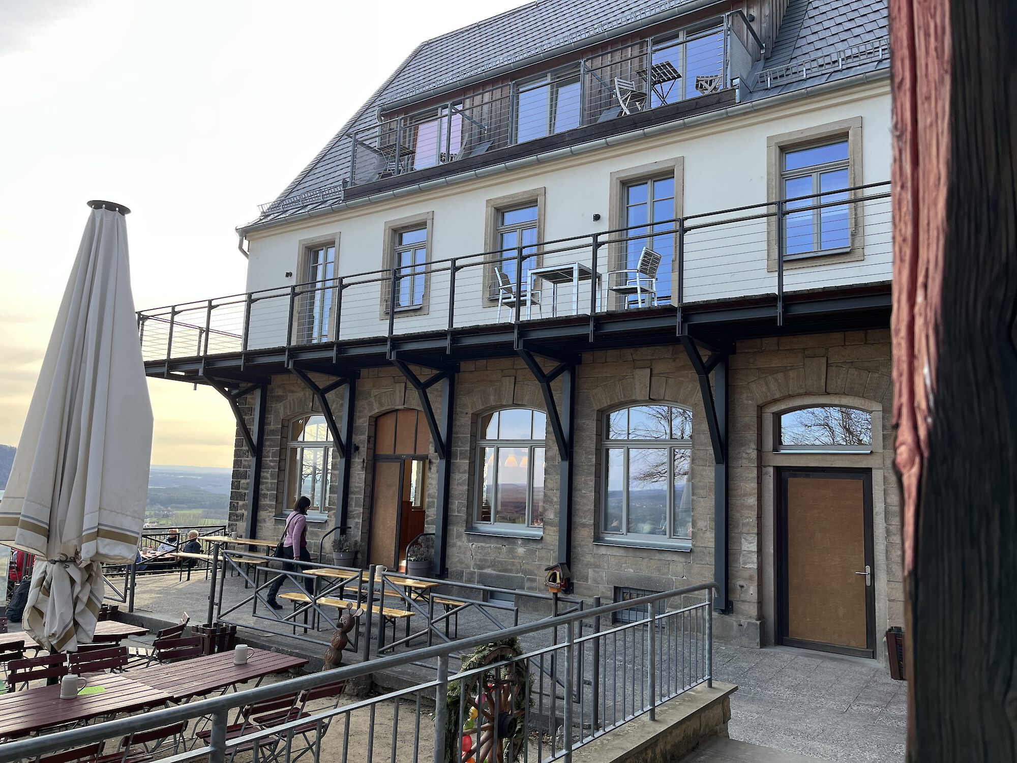 Vor dem Saal befindet sich eine abgeteilte, zum Saal gehörende Terrasse mit Blick zur Aussicht. Auf der Rückseite des Gebäudes (nach Westen, mit Abendsonne) gibt es zusätzlich eine separate Terrasse mitten im Grün der Natur, die von den Tagesgästen abgeschirmt ist und exklusiv genutzt werden kann.