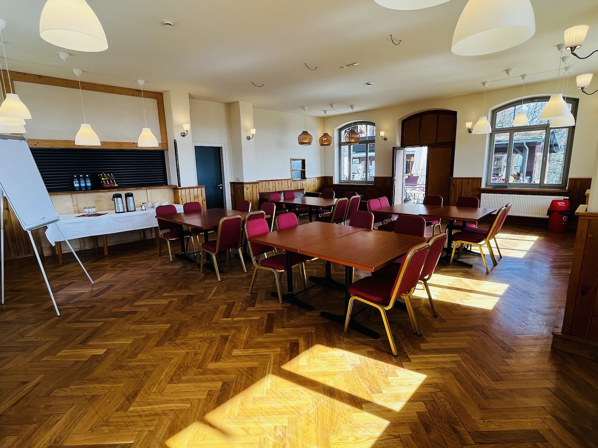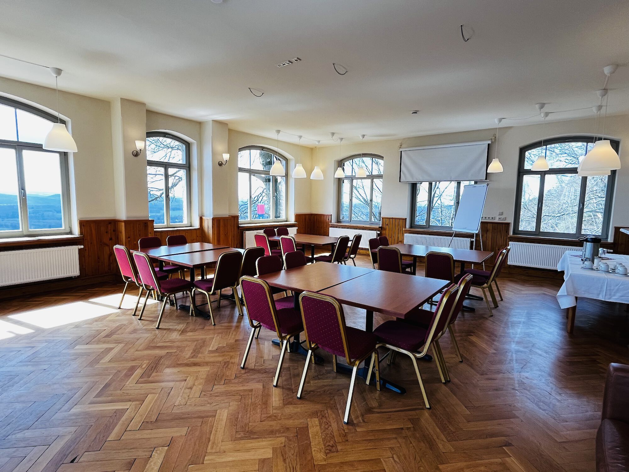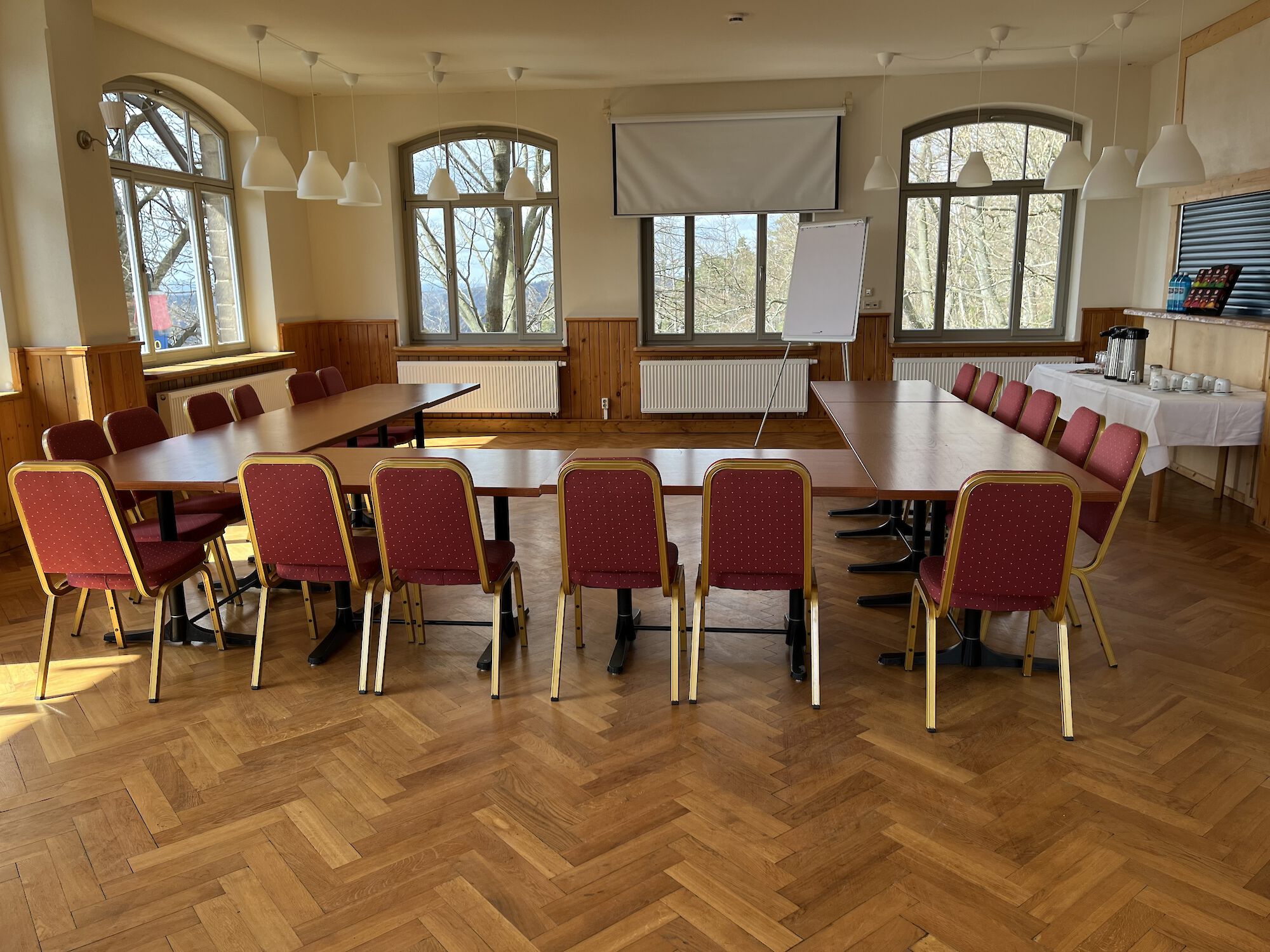An Veranstaltungstechnik stehen Leinwand, Beamer, Tonanlage und Flipchart zur Verfügung.